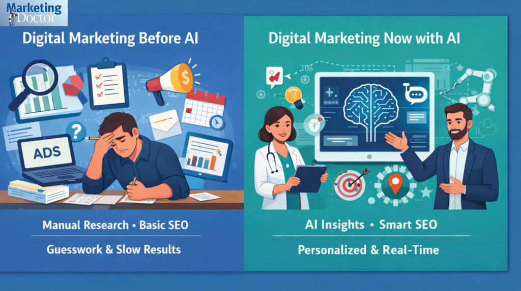 Digital marketing has gone through a massive transformation over the last decade. What once depended heavily on manual work, guesswork, and long timelines has now become faster, smarter, and more data-driven—thanks largely to Artificial Intelligence (AI). For professionals like doctors, clinics, and hospitals, this shift has completely changed how patients discover, evaluate, and choose healthcare services online, making digital marketing for doctors more strategic and results-oriented than ever before. Understanding the difference between digital marketing before AI and digital marketing now is essential for staying competitive in today’s healthcare market.